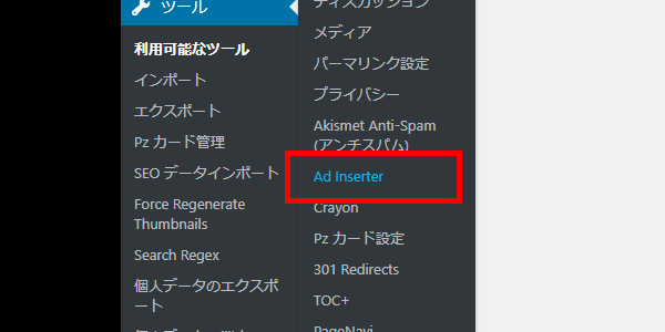 有効化ができたら、プラグインの設定です。WordPress管理画面の「設定」から、「Ad Inserter」メニューをクリックします。