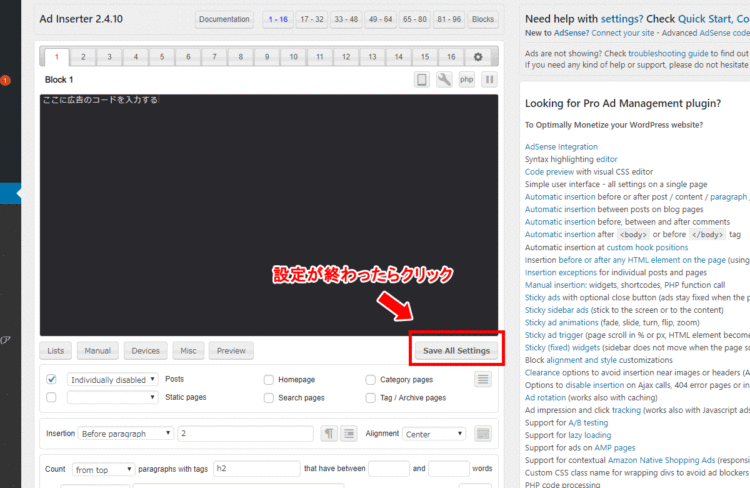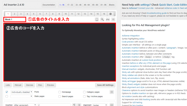 プラグインの有効化が出来たら、次は広告や文章の設定です。