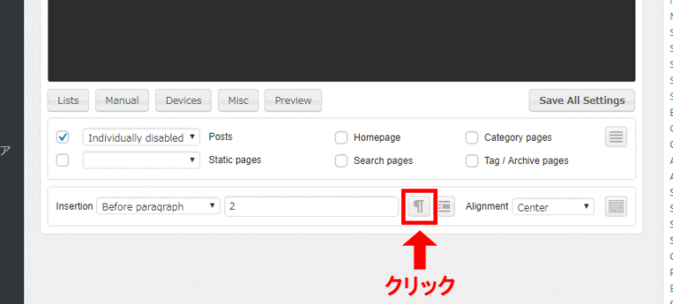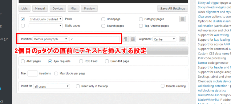 「Ad Inserter」の「Before paragraph」の設定では、本文の何個目のpタグの直前にテキストを挿入するか設定ができます。