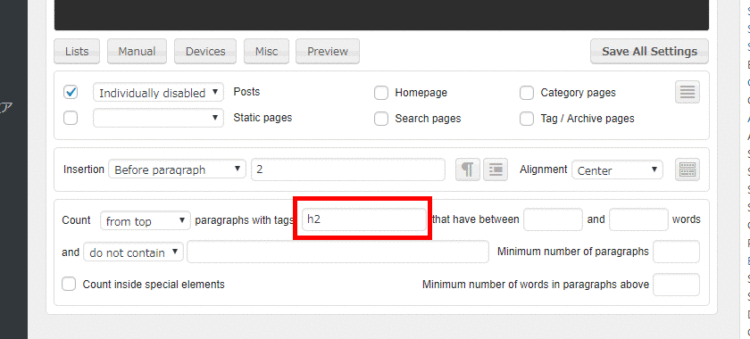 「paragraphs with tags」の設定がありますので、「h2」と指定します。そうすると、記事本文中の2つ目のh2タグの直前に、広告や文章が表示されます。