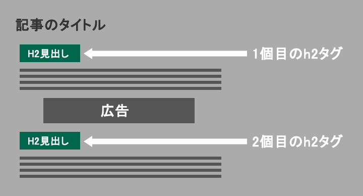 2つ目のH2タグの前に広告を表示されたイメージです。他のタグも自由に設定できます。