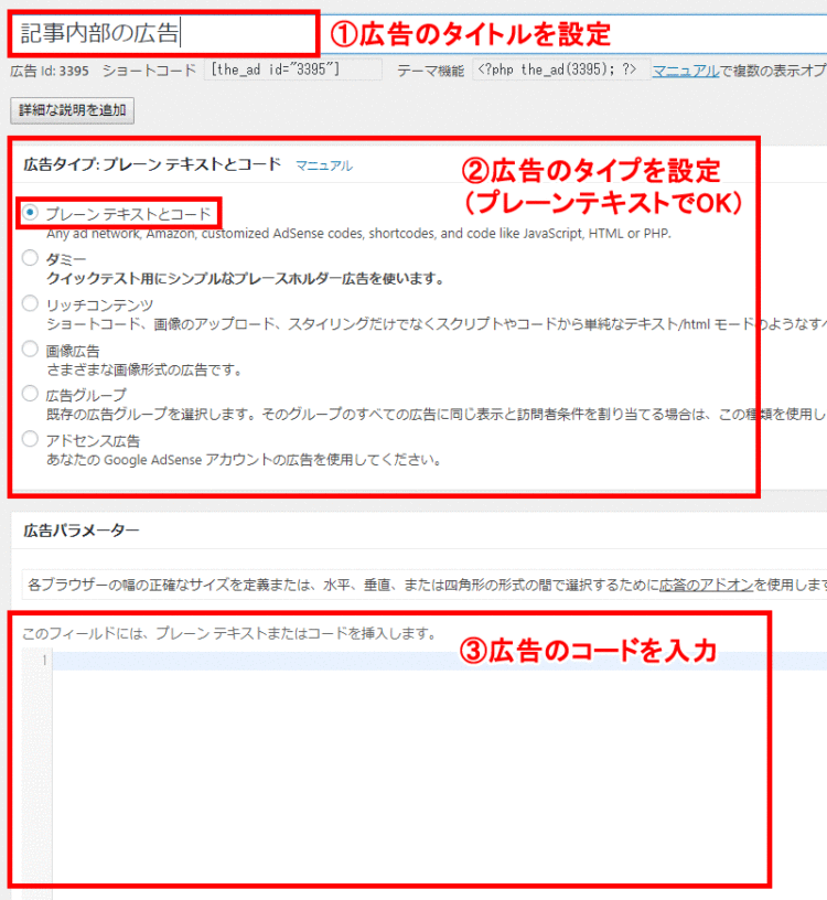 最後に、広告パラメーターを入力します。ここには広告や文章のコードを入力します。広告なら、HTMLとかJavaScriptのコードですね。