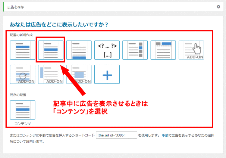 広告や文章を掲載する場所として様々な選択肢がありますが、記事中に広告や文章を表示させたい場合は、「コンテンツ」ボタンをクリックしての配置を決定します。