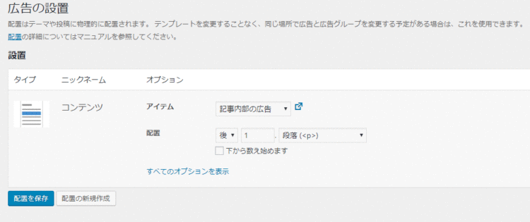ここでは、オプションとして「アイテム」と「配置」を設定できます。「アイテム」はプラグインで管理している広告のことです。先ほど設定したものですね。