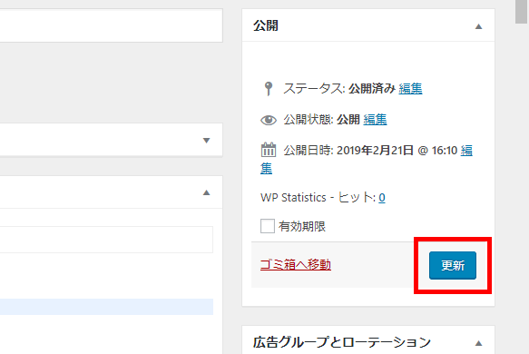 既存の広告を編集する場合は、広告の設定を保存する時「公開」ボタンではなく「更新」ボタンとなります。