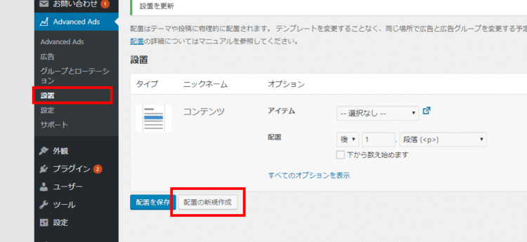 それでは「広告の設置」の調整をしましょう。ここでは配置する広告の細かい調整が可能です。