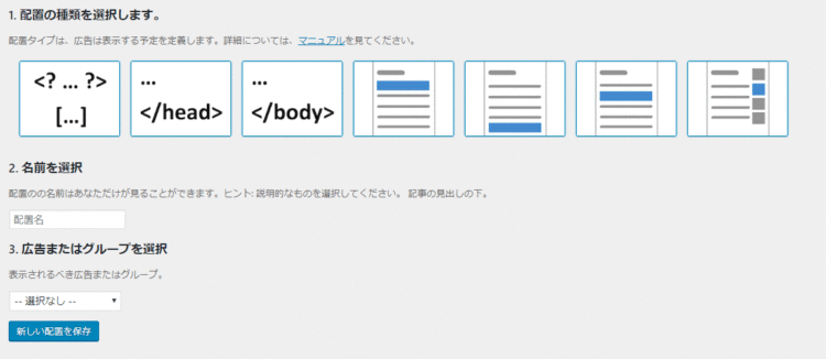 ここで、広告の配置の設定ができます。配置の名前や、配置を適用させる広告を設定します。