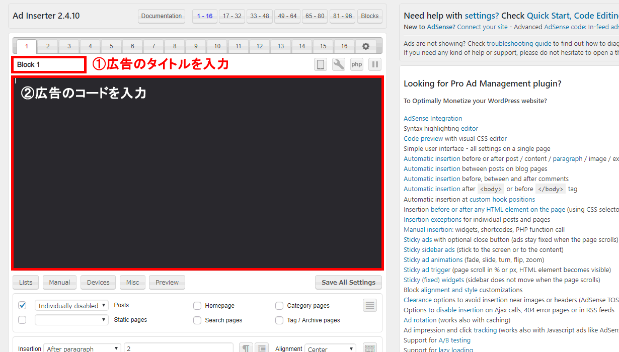 プラグインの設定画面です。まず背景が黒いテキストボックスの中に、自動挿入したい広告コードや定型文を入力します。
