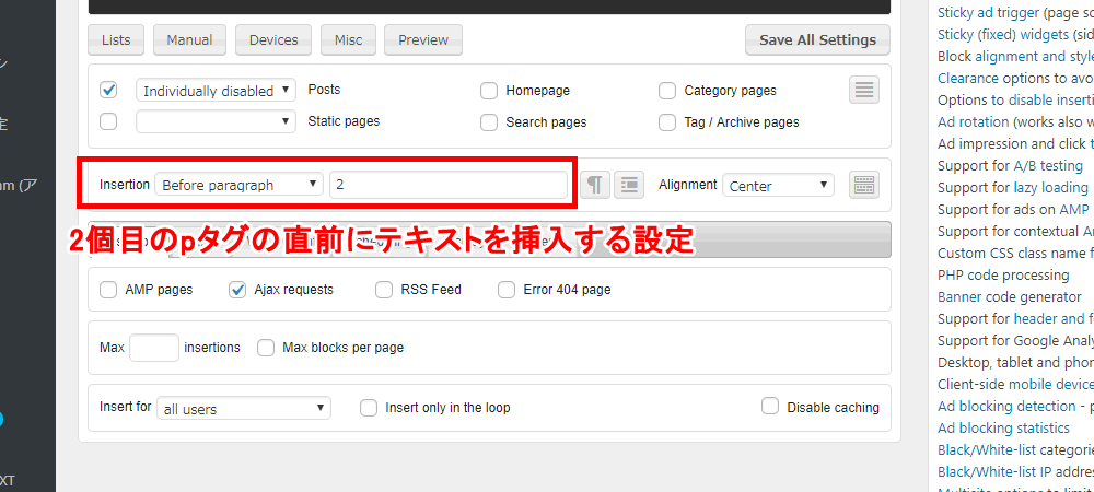 「Ad Inserter」の「Before paragraph」の設定では、本文の何個目のpタグの直前にテキストを挿入するか設定ができます。
