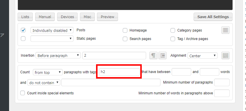 「paragraphs with tags」の設定がありますので、「h2」と指定します。そうすると、記事本文中の2つ目のh2タグの直前に、広告や文章が表示されます。