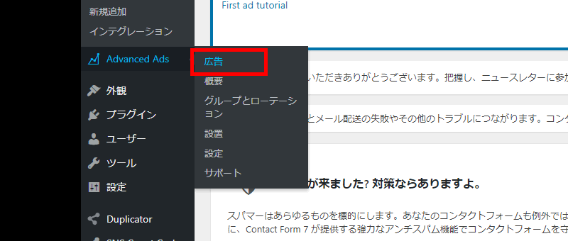 WordPressの管理画面「Advanced Ads」メニューから、「広告」メニューをクリックします。