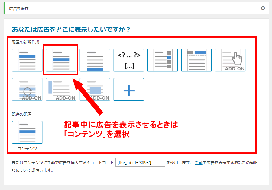 広告や文章を掲載する場所として様々な選択肢がありますが、記事中に広告や文章を表示させたい場合は、「コンテンツ」ボタンをクリックしての配置を決定します。