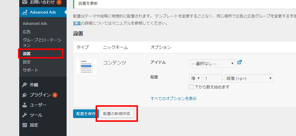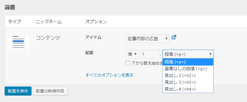 ここでは、オプションとして「アイテム」と「配置」を設定できます。「アイテム」はプラグインで管理している広告のことです。先ほど設定したものですね。