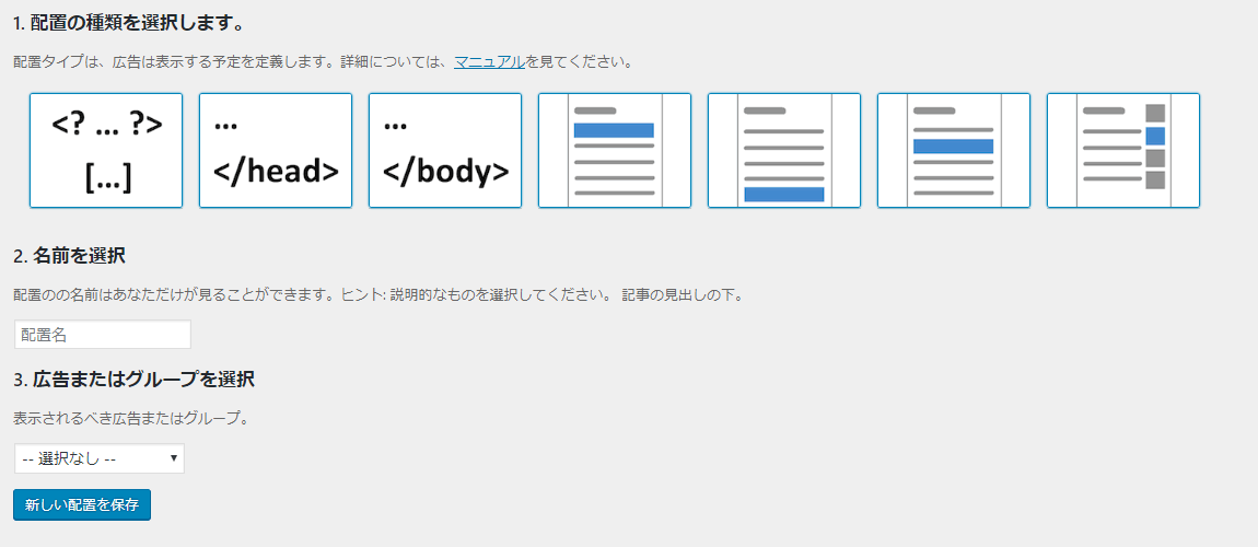 ここで、広告の配置の設定ができます。配置の名前や、配置を適用させる広告を設定します。