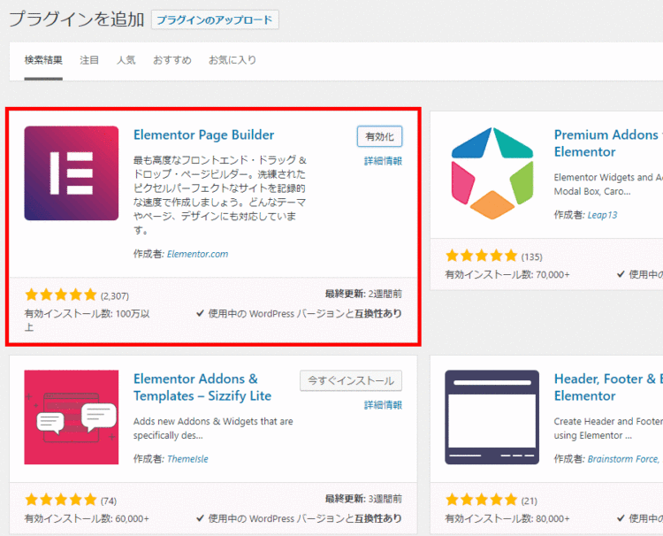 さっそくインストールしましょう。管理画面のプラグイン検索から、「Elementor」と検索してインストールします。