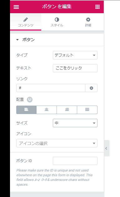 「ボタンを編集」画面には、「コンテンツ」「スタイル」「詳細」の3つのタブがあります。
