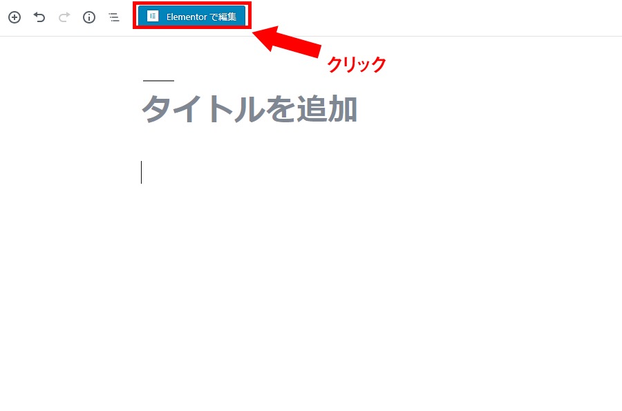 新規ページ作成画面に、「Elementorで編集」ボタンが表示されています。このボタンをクリックして、Elementorの編集画面へ移動しましょう。