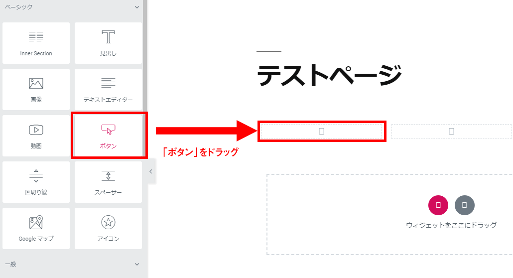 「ウィジェットをここへドラッグ」のエリアに、直接ウィジェットをドラッグして配置すると、カラム数が1つのセクションが自動的に作られてウィジェットが収まります。
