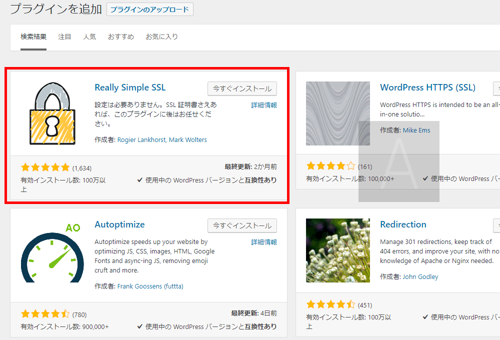 プラグイン「Really Simple SSL」は、WordPressの公式プラグインです。WordPressの管理画面から、簡単にインストールできます。