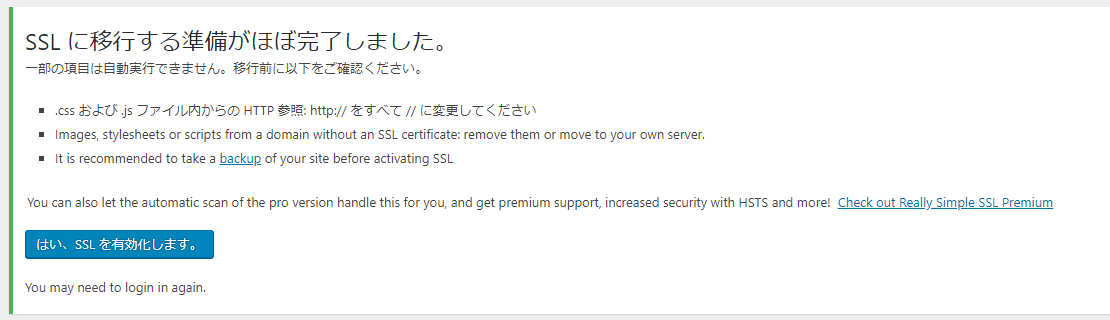 「SSLを有効化しました。」とメッセージが表示されたら、WordPressのSSL化が完了です。