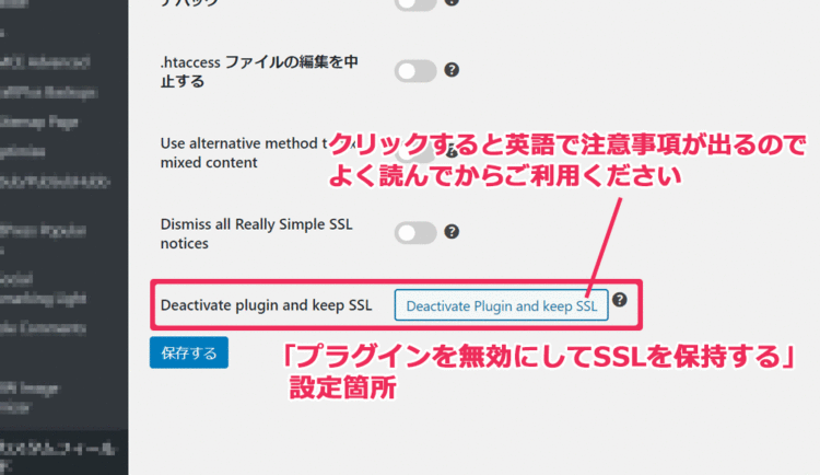 設定の中に「プラグインを無効にしてもSSLを保持する」という項目がありますが、 これを設定してから無効化した場合には、いくつか注意点があるようです。