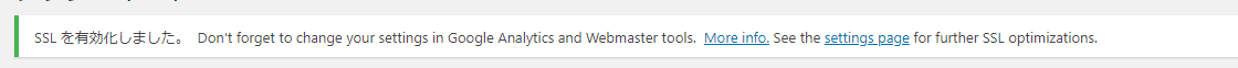 「SSLを有効化しました。」とメッセージが表示されたら、WordPressのSSL化が完了です。