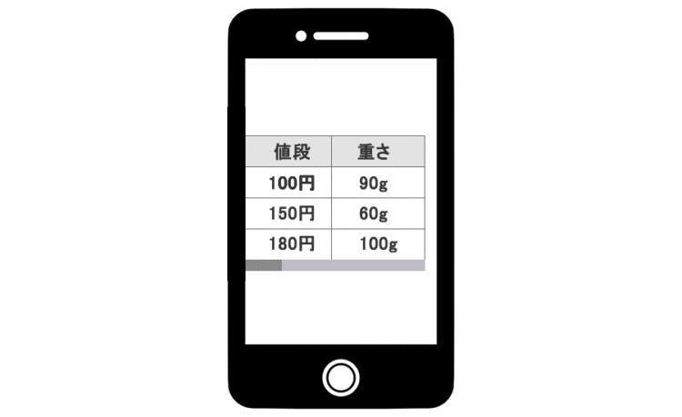 値段の列の右隣りには、「重さ」の列があるはずなのですが、スマートフォンの横幅よりも、テーブル(表)の横幅の方が広く表示されていません。