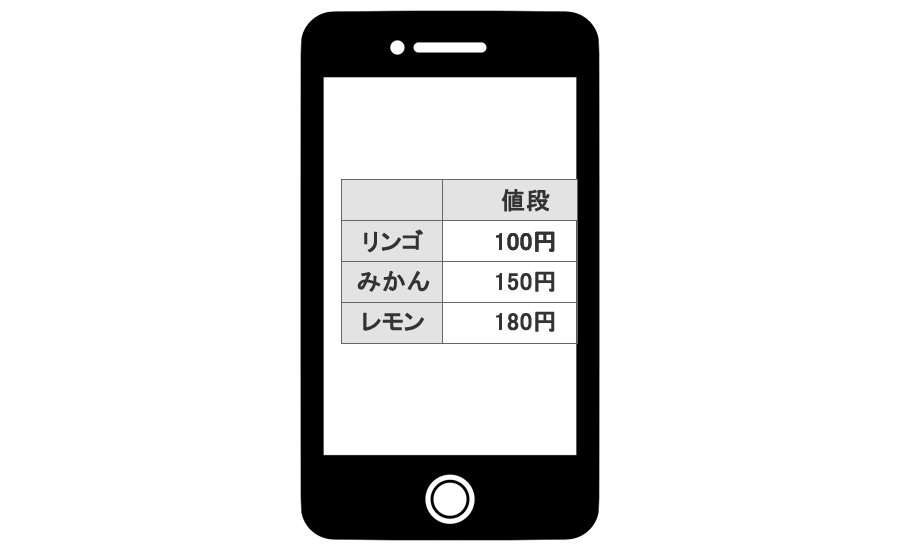 <div class="table-wrapper"> <table> <tr> <th></th> <th>値段</th> <th>重さ</th> </tr> <tr> <th>リンゴ</th> <td>100円</td> <td>90g</td> </tr> <tr> <th>みかん</th> <td>150円</td> <td>60g</td> </tr> <tr> <th>レモン</th> <td>180円</td> <td>100g</td> </tr> </table> </div>
