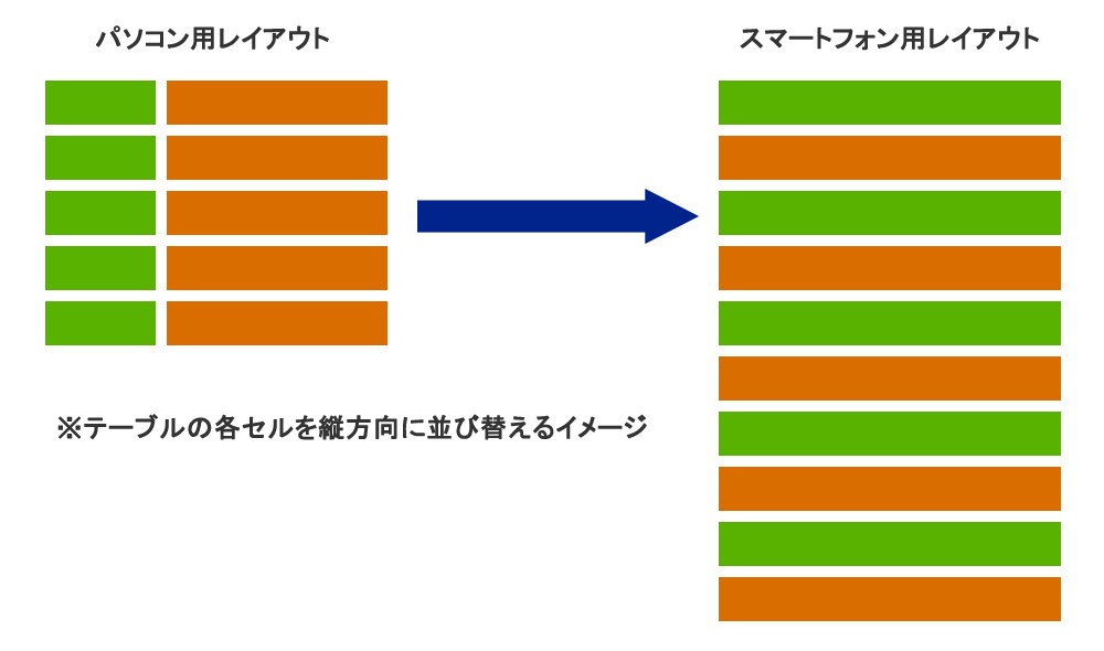 ※ただし、テーブル(表)をレスポンシブウェブデザインで縦ならびにする方法は、テーブル(表)が2列の場合には成立しますが、3列以上の場合には、表頭のセル(<tr>など)と内容のセル(<td>)の位置的関係が意図しない形になる場合があります。